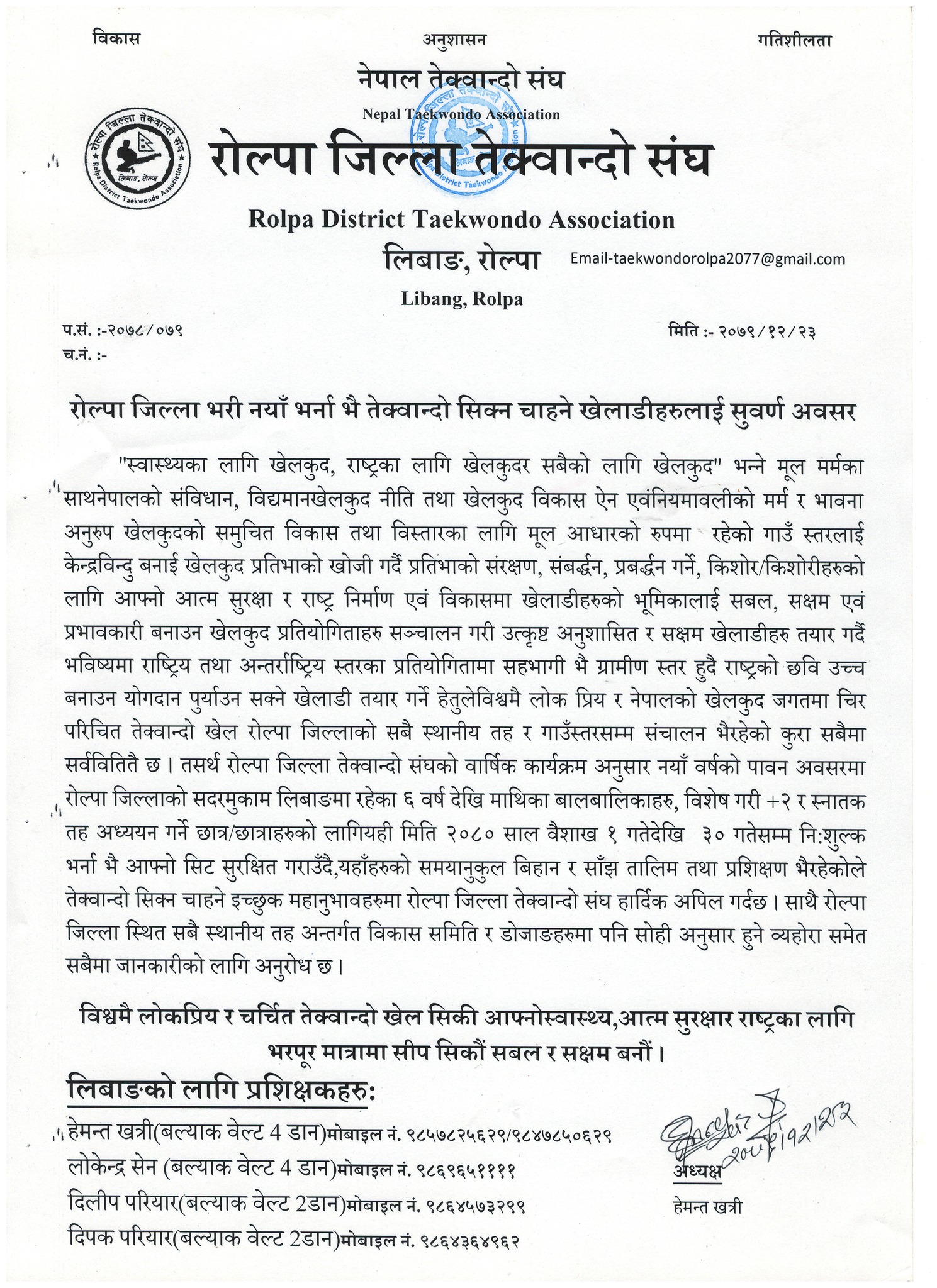 रोल्पा जिल्ला तेक्वान्दो संघको वार्षिक साधारण सभा सम्पन्न । नेपाल तेक्वान्दो संघ, प्रदेश तेक्वान्दो संघको बार्षिक कार्यक्रम अनुसार रोल्पा जिल्ला तेक्वान्न्दो संघको वार्षिक साधारण सभा मिति २०७९ साल चैत्र १४ गते सम्पन्न भएको छ । रोल्पा जिल्ला तेक्वान्दो संघका उपाध्यक्ष त्रिभुवन रानाको स्वागत मन्तव्यबाट शुरु भएको कार्यक्रम रोल्पा जिल्ला तेक्वान्दो संघका अध्यक्ष हेमन्त खत्रीले अध्यक्षता…